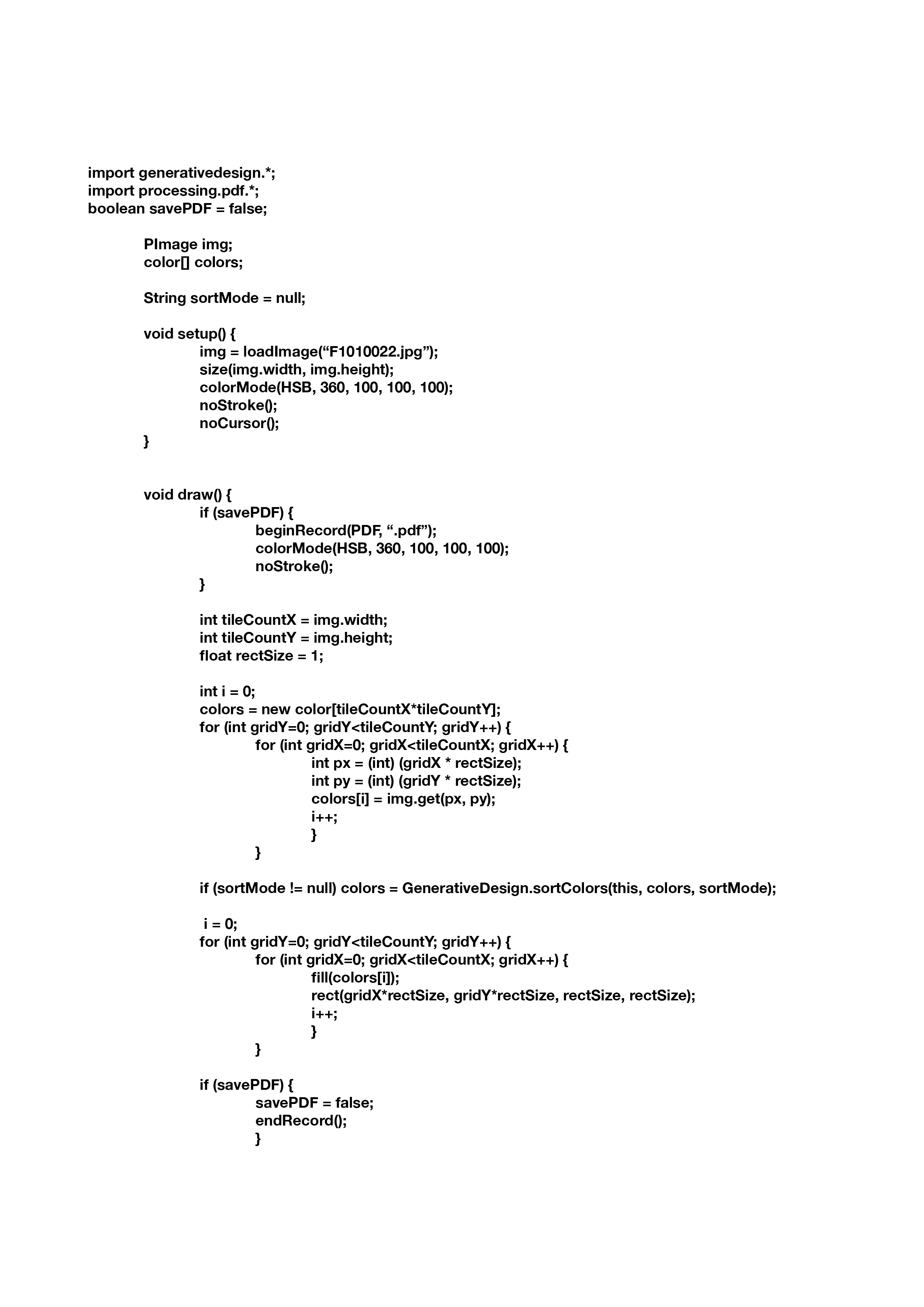 Arrangements is based on a Processing algorithm, which rearranges all the pixels of a digital image according to their degree of brightness. Any image passed through the algorithm is turned into an abstraction. The material of the processed image is virtually the same as that of the original, since all the pixels are still present in the output, only rearranged. I chose to input some of the most expensive photographs sold in the world, in order to reflect upon the economic value of artworks, as well as the materiality of images. The photographs are intended to be printed at the same size as their original.