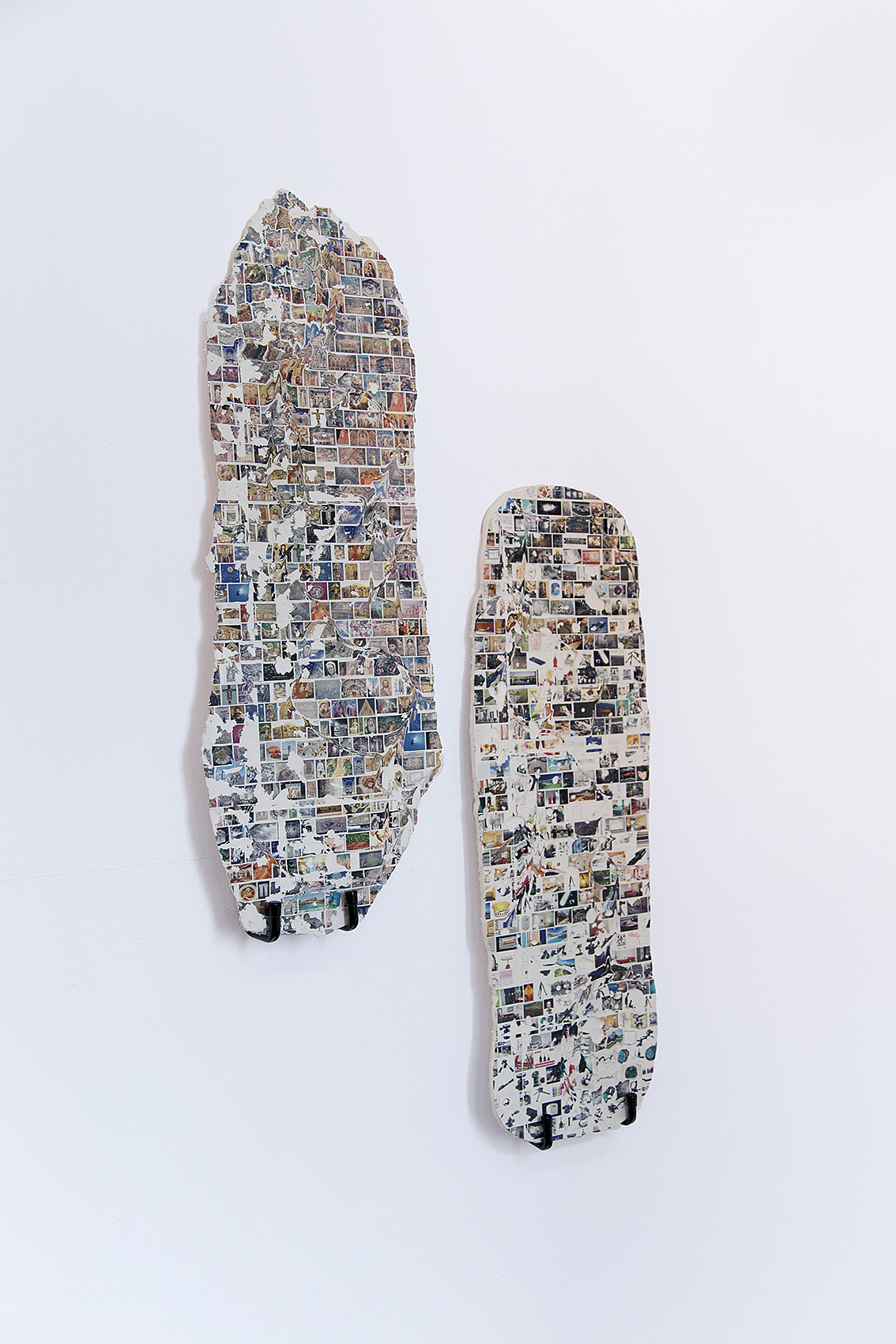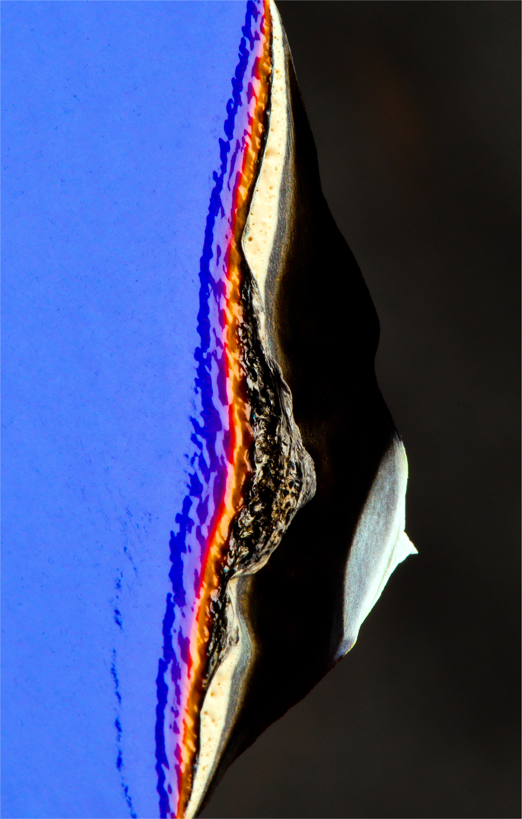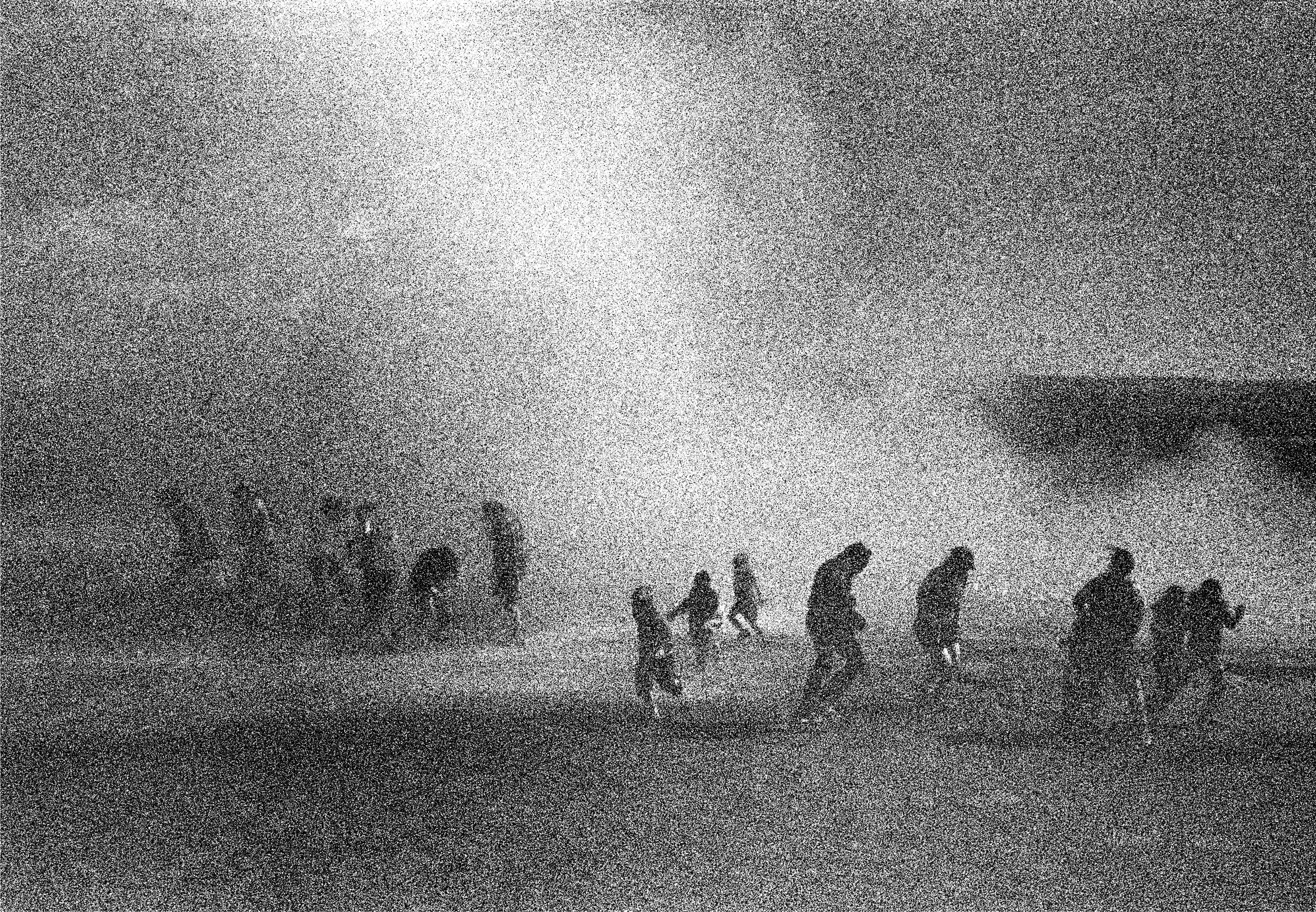 Found photo prints were cut, assembled, glued and rephotographed, burning in the studio. The surface of the burning prints progressively dissolves as the image becomes unrecognizable and new figures emerge from this destructive process.